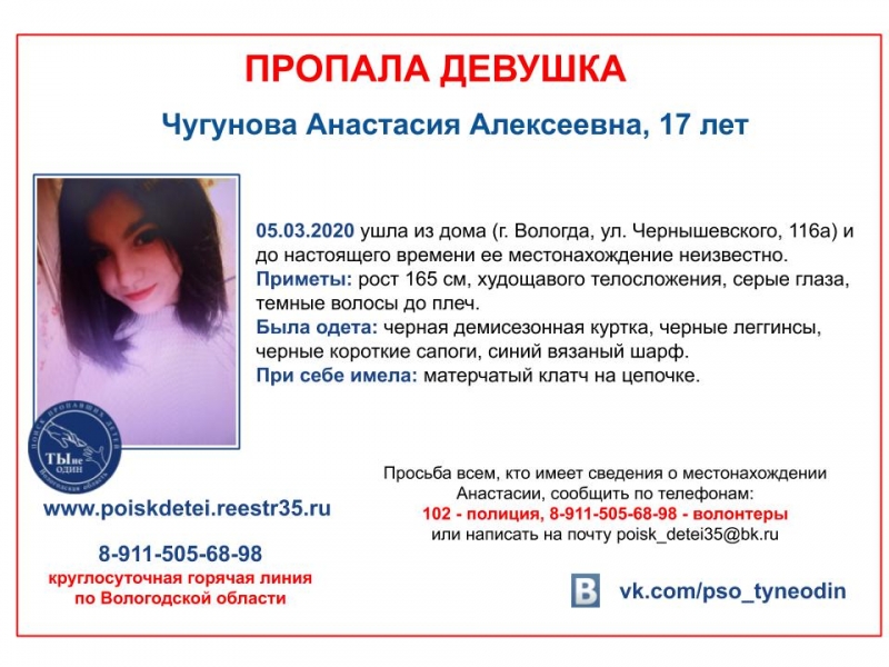 17-летняя Анастасия Чугунова ушла из дома ещё 5 марта. Подросток живёт в доме на Чернышевского, 116а в областной столице. Сегодня информация о пропаже появилась в группе ПСО "Ты не один".