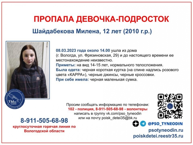 Жительница Вологды ушла из дома на Фрязиновской, 29. Это произошло около 14 часов 8 марта, и с тех пор о местонахождении школьницы ее близкие не знают. К поискам подключились волонтеры.