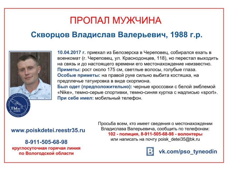 Рост пропавшего составляет 175 сантиметров, волосы светлые, глаза голубые. На предплечье есть татуировка в виде скорпиона. Пропавший был одет в чёрные кроссовки, тёмно-серые штаны и тёмно-синюю куртку, сообщает ИА "СеверИнформ" со ссылкой на ПСО "Ты не один".