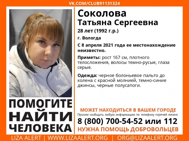 28-летняя Татьяна Соколова пропала на прошлой неделе. До сих пор о местонахождении вологжанки ничего не известно. К поискам подключились волонтеры.