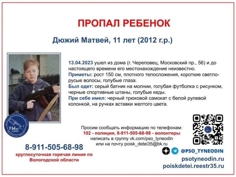 Мальчик ростом 150 сантиметров, плотного телосложения, с короткими светлыми волосами и голубыми глазами. Был одет в серый батник на молнии, голубую футболку с рисунком, черные спортивные штаны, голубые кеды. С собой взял черный трюковый самокат с белой рулевой колонкой, на ручках желтые вставки.
