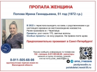 Ирине Поповой 51 год. Она родом из Череповца. В один из дней женщина просто испарилась. Потом ее видели в Санкт-Петербурге. По некоторым данным, она и сейчас может находиться в северной столице.