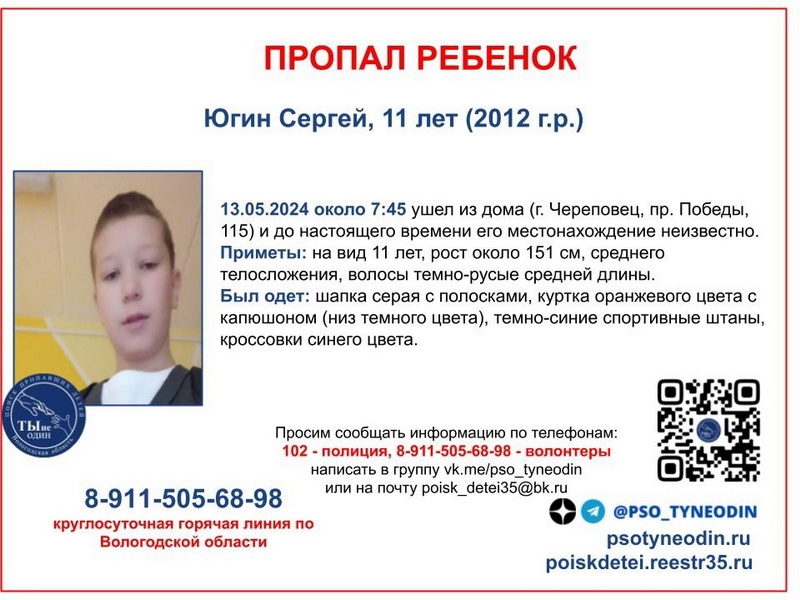 Сергей Югин живет в Череповце. Когда он уходил, на нем была оранжевая куртка, спортивные штаны и серая шапка. На вид ребенку лет 11, у него темно-русые волосы.