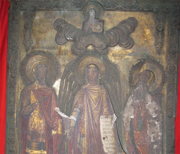 Икона примерно метр в высоту, на потемневшей доске едва просматривались лики святых Александра Невского, архистратига Михаила и Николая Чудотворца. Нашедшие образ не знали, в какой храм отдать икону, поэтому решили хранить ее у себя дома, в Череповце. А зимой Евгений Шитов случайно встретил священника Романа Зайцева и рассказал о находке. Когда Евгений узнал, что отец Роман служит как раз в шекснинском храме иконы Казанской Божьей Матери, он отдал ему икону.