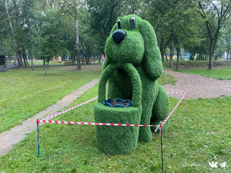 Топиарная фигура собаки в Череповце теперь находится в парке 200-летия.