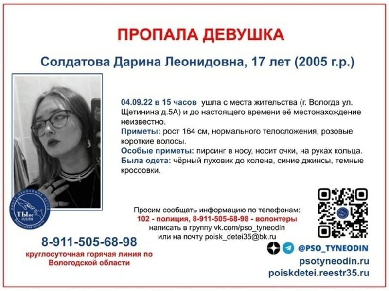 Приметы: рост 164 см, розовые волосы, пирсинг в носу, носит очки. Была одета в черный пуховик, джинсы и кроссовки.