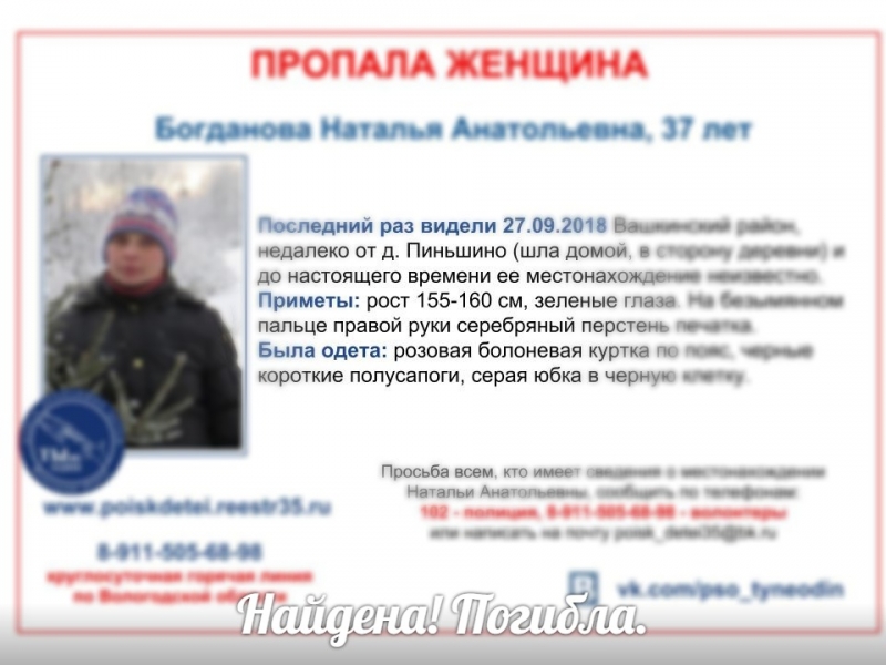 В Вашкинском районе найдена погибшей местная жительница, пропавшая еще в конце октября. 37-летнюю женщину в последний раз видели 27 сентября, когда она возвращалась домой в деревню Пиньшино. По информации следственного управления СК РФ по Вологодской области, которое ведет проверку по факту ЧП, есть свидетельства, что селянка в тот день была пьяна.