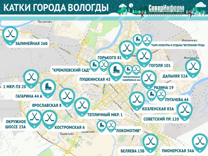 Напомним, покататься на коньках можно будет на стадионе «Динамо» и у СК «Спектр», а также на прудах в парке Ветеранов и в Кремлевском саду, как только лед достигнет там безопасной толщины. На территориях школ организуют хоккейные корты. Чтобы вам было проще ориентироваться, корреспонденты редакции ИА «СеверИнформ» подготовили для вас карту катков Вологды.