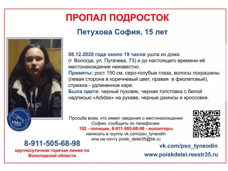 По данным ПСО "Ты не один", девочка ростом 150 сантиметров, у нее серо-голубые глаза, половина волос покрашена в коричневый цвет, половина - в фиолетовый. Была одета в черный пуховик, черную толстовку, черные джинсы и кроссовки.