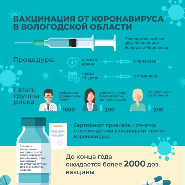 "Всего до конца года будет предоставлено региону 2 тысячи доз. Первыми вакцину получат вологжане, относящиеся к группам риска: медицинские работники (1 600 человек), учителя и воспитатели (200 доз), социальные работники (200 доз). Также внимание будет уделяться людям старшего поколения и людям с хроническими заболеваниями", - рассказал губернатор Вологодской области Олег Кувшинников.