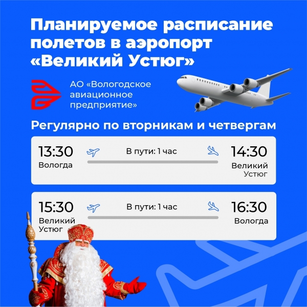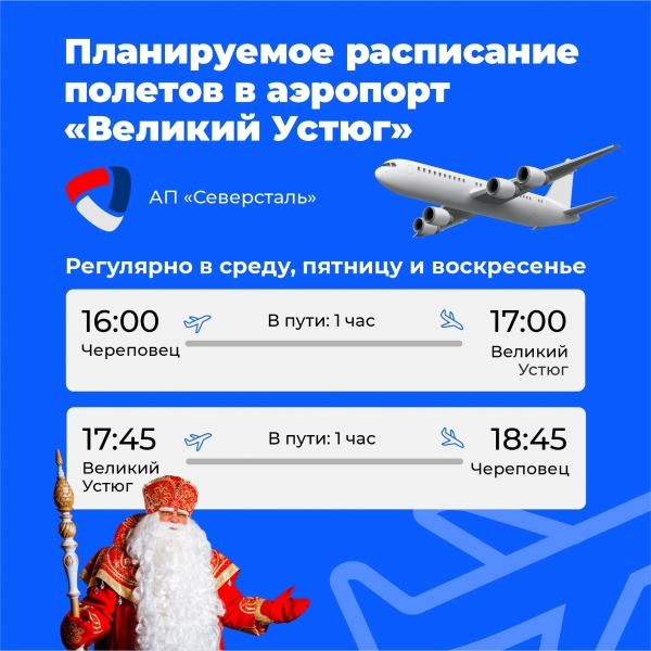 «Расписание готово. На вотчину Деда Мороза самолеты будут летать пять раз в неделю. Туристам из Москвы и Санкт-Петербурга также будет удобно добираться в Великий Устюг через Череповец: рейсы стыковочные. В аэропортовом комплексе выполнены удлинение взлетно-посадочной полосы, асфальтирование перрона, монтаж приводных маяков и светосигнального оборудования, благоустройство территории летного поля и здания аэровокзального комплекса. Работы по реконструкции продолжатся», - рассказал губернатор региона Олег Кувшинников.
