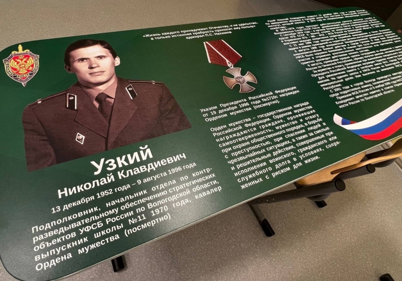 Школа №11 в Вологде носит имя кавалера Ордена мужества подполковника Федеральной службы Николая Узкого. В прошлом году в день 70-летия героя был открыт Зал славы. Накануне в нем состоялось торжественное мероприятие. Теперь в школе есть парта, рассказывающая о подвиге Николая Клавдиевича, погибшего 27 лет назад в Чечне.