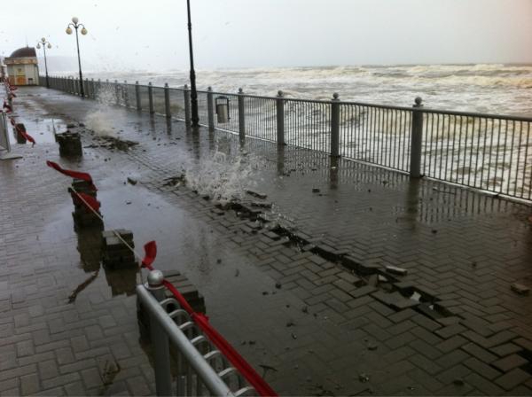 Очевидцы сообщают о том, что в железобетонной конструкции светлогорского променада местами видны разломы, через которые фонтанирует морская вода.