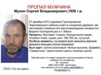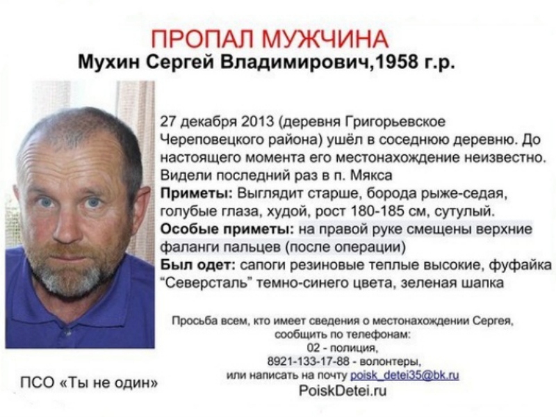 Второй пропавший — житель села Григорьевское, 55-летний Сергей Мухин — исчез 27 декабря. Он ушел в соседнюю деревню, однако назад так и не вернулся. Позже он был замечен в поселке Мякса, однако в настоящее время местонахождение мужчины по-прежнему неизвестно, сообщает ИА «СеверИнформ».