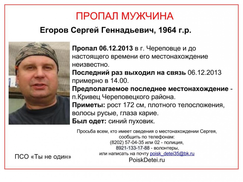 Двое мужчин считаются пропавшими с прошлого года в Вологодской области. Оба являются жителями Череповецкого района. Один из них — 49-летний череповчанин Сергей Егоров пропал еще в начале декабря 2013 года. На связь мужчина перестал выходить 6-го числа. Поиски до сих пор продолжаются.