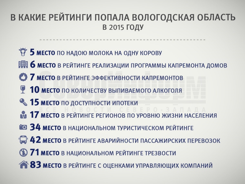 При подведении итогов ушедшего года достаточно посмотреть, как оценивали Вологодскую область эксперты. Достижения, провалы и перемены нашли отражение во многих рейтингах. ИА «СеверИнформ» предлагает вспомнить, чем же отличился наш регион в различных сферах жизнедеятельности.