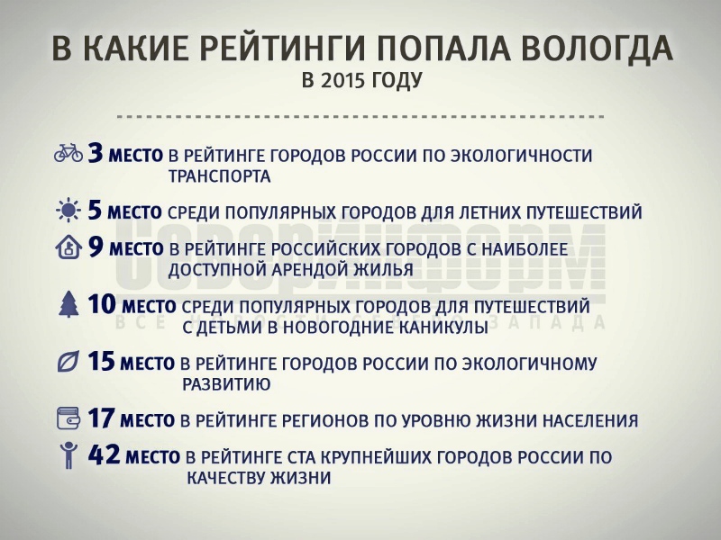 При этом два крупнейших города области вошли в сотню лучших по качеству жизни. Такие данные представили на XIV Общероссийском форуме «Стратегическое планирование в регионах и городах России» в Санкт-Петербурге. Вологда разместилась на 42 месте, а Череповец — на 11. В методологию рейтинга вошли два глобальных показателя: качество городской среды и стоимость жизни.