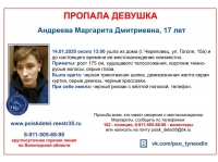 Маргарита Андреева ушла из дома около 13 часов 14 января. С тех пор о местонахождении подростка ничего не известно. К поискам подключились волонтеры.