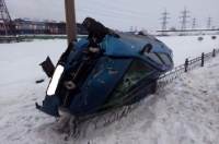 На скользкой дороге Рено занесло, она перелетела через барьерное ограждение, перевернулась в воздухе на бок и, задев опору линии электропередачи, прилегла межу ней и забором.