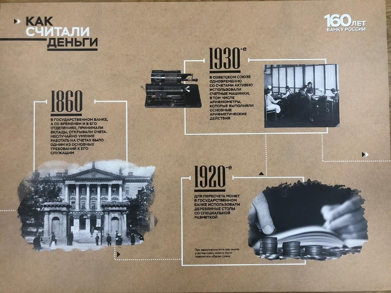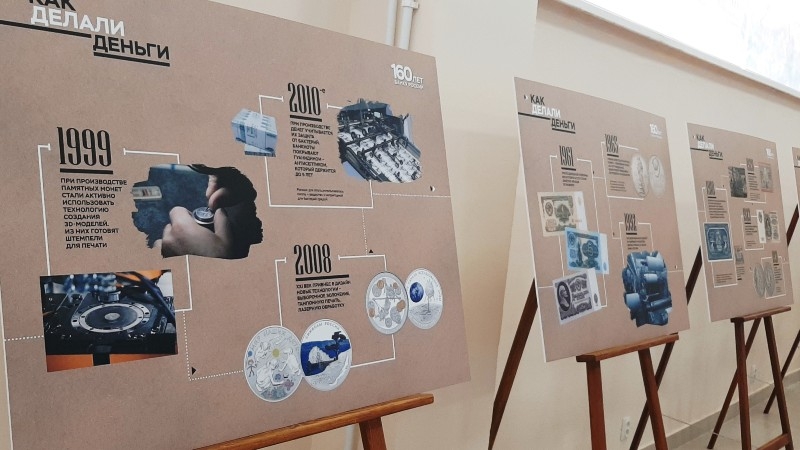Экспозиция подготовлена Банком России к своему 160-летию. На ней представлена история денег — их изготовление, защита, подсчет, транспортировка, хранение. Выполнена она на фотополотнах в пяти тематических блоках.