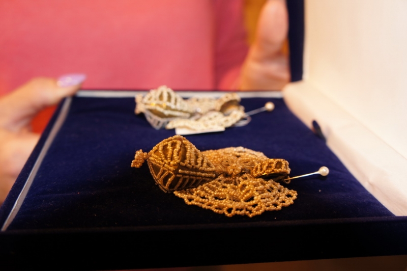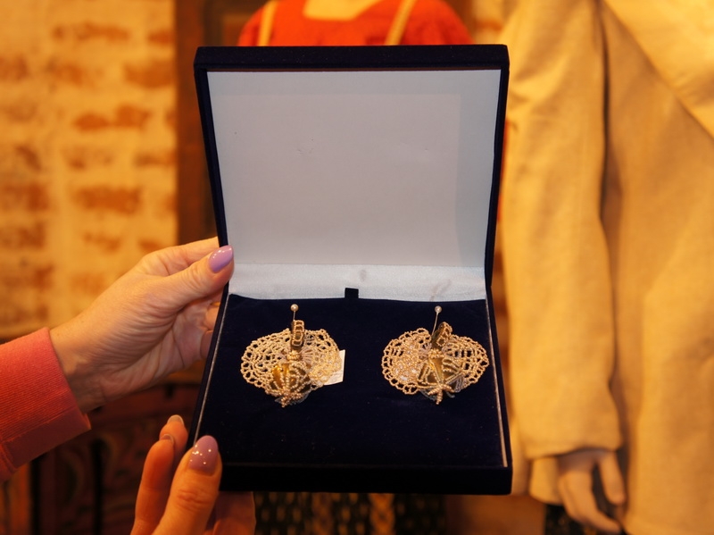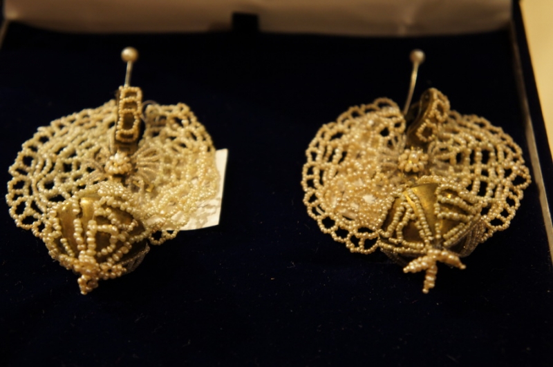 «Такие «бабочки» были самым распространенным типом серег на Русском Севере. Их надевали с праздничным костюмом. Размер сережек и материал зависел от благосостояния крестьянки. Жемчужные серьги были одним из самых дорогих украшений. Они вносили в костюм элемент роскоши и щегольства. В начале XIX века серьги стоили от 30 до 100 рублей. Несмотря на это, они пользовались большим спросом. Серьги, представленные в Кирилло-Белозерском музее, авторский вариант олонецких украшений. Они выполнены из жемчуга, размер составляет 6,5 см на 6 см на 2,5 см», - рассказал генеральный директор музея-заповедника Михаил Шаромазов.