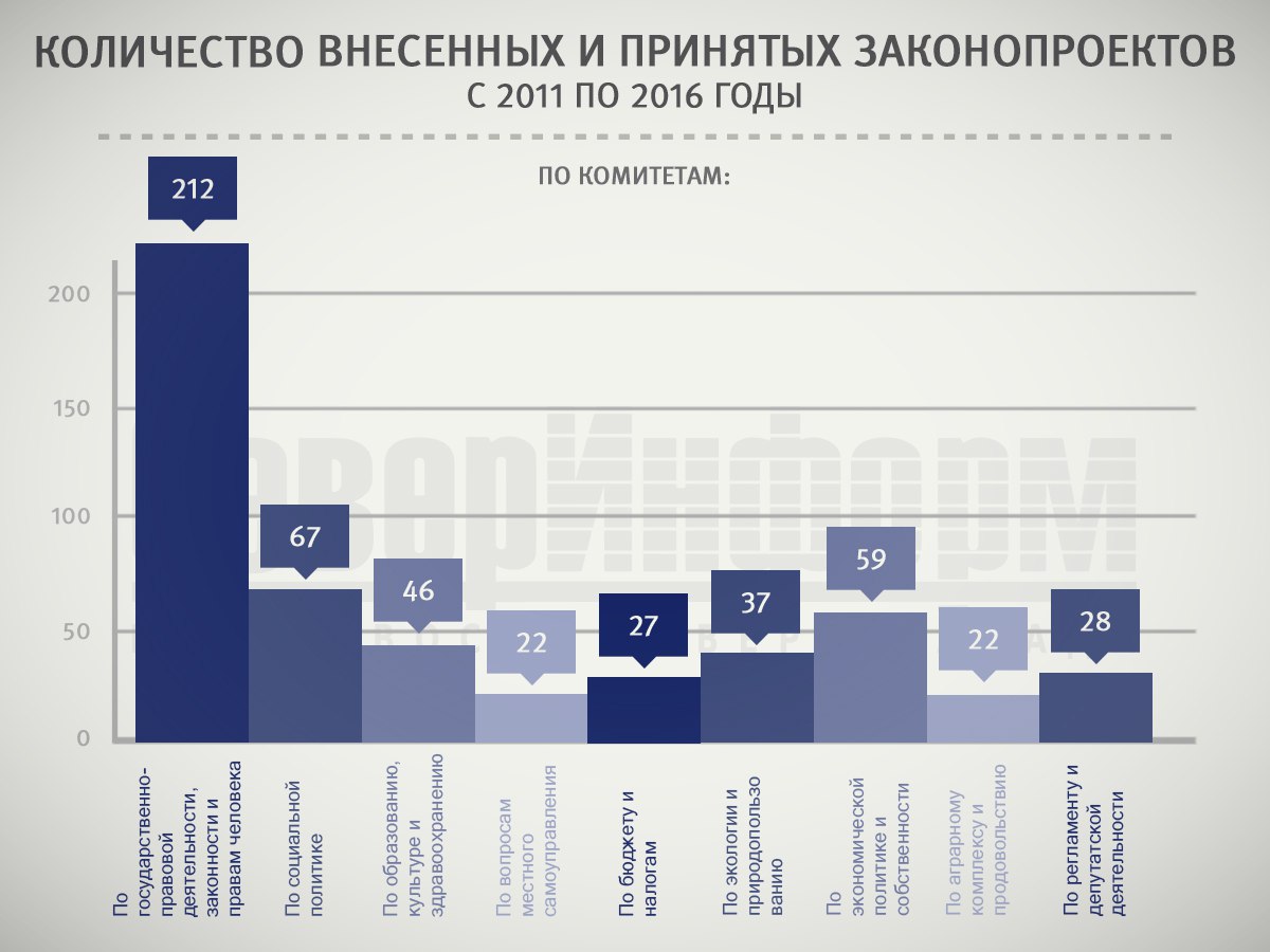 Для сравнения — комитет по аграрному комплексу и продовольствию внес всего 22 законопроекта с конца 2011 года. И это один из самых низких показателей. Это крайне удивительно в том смысле, что регион у нас исторически аграрный. И, с другой стороны, совсем неудивительно, судя по нынешнему незавидному состоянию сельскохозяйственной отрасли. Быть может, парламентарии считают, что своими идеями они сделают аграрному комплексу еще больнее и потому лишний раз не лезут? Что ж, это был бы, по крайней мере, честный подход.