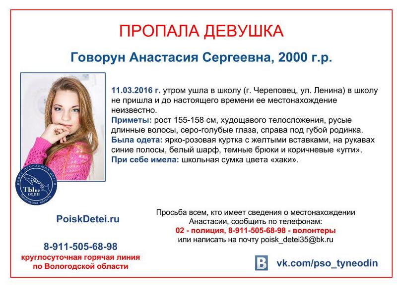 В Череповце разыскивают 16-летнюю девушку. Анастасия Говорун утром 11 марта ушла в школу. До настоящего времени ее местонахождение неизвестно, сообщает ИА «СеверИнформ» со ссылкой на ПСО «Ты не один».
