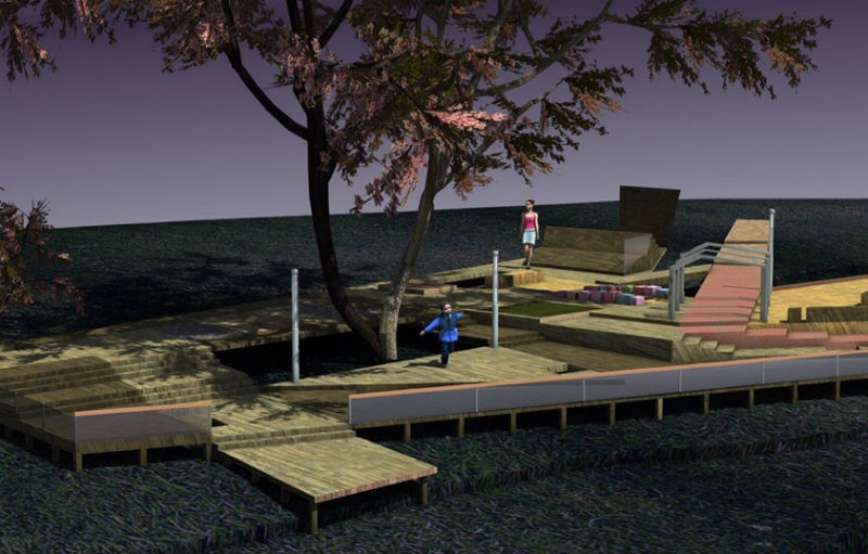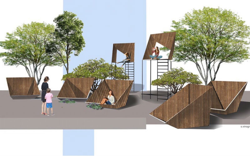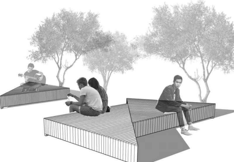 На первом проекте представлен комплекс мобильных лавок и подиумов из дерева для комфортного отдыха посетителей и проведения общественных мероприятий. Скамейки, как предполагают авторы, напоминают посадочные места в театре