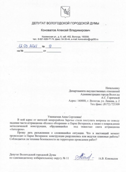 Депутат городской Думы Алексей Коновалов написал о саморазрушении старой конструкции. Но в администрации рассказали другую версию: мол, начался демонтаж аттракциона. В этом заявлении много нестыковок, которые и отметил народный избранник и направил депутатский запрос в департамент имущественных отношений Вологды.