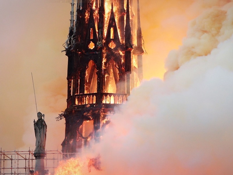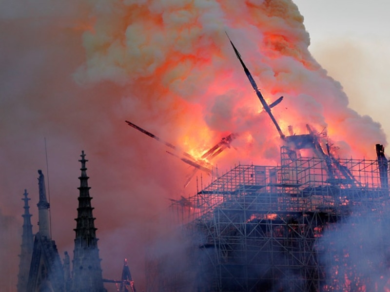 Пожар начался сегодня, 15 апреля, вечером и продолжается до сих пор. Огонь распространился на несущую конструкцию собора. Крыша, шпиль и часы уже рухнули, интерьеры уничтожены.