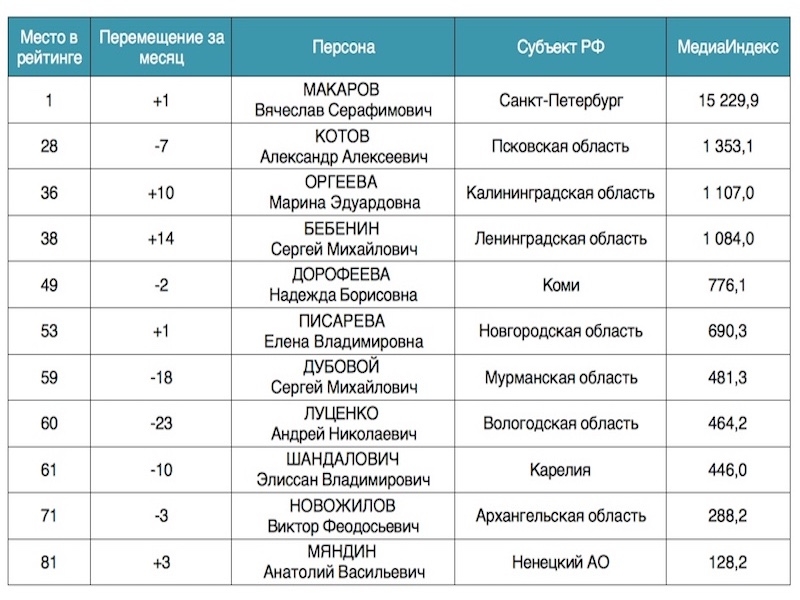 Лидирующие позиции занимает руководитель Заксобрания Санкт-Петербурга Вячеслав Макаров, который по сравнению с мартом улучшил свою позицию на 1 пункт.