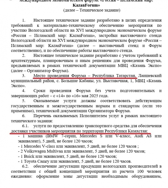 Согласно техническому заданию в расходы входит создание стенда "Место силы Русского Севера", дегустационная продукция (икра, масло и др.), организация работы самого стенда, кофе-брейки на 20 человек, разработка брошюр о Вологодской области на русском и английском языках по 100 штук, а также услуги по предоставлению премиальных транспортных средств, таких как: BMW 7-серии, Mercedes S или V-класс, Audi A8 или эквивалент- 1 машина; Mercedes V-class или эквивалент – 1 машина; Volkswagen Multivan или эквивалент – 2 машины; Buick или эквивалент; Toyota Camry или эквивалент – 1 машина для перемещения участников мероприятия на 5 дней, не более 120 часов.