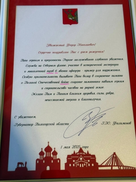Ранее, на 9 мая, произошел казус и вызвал большой резонанс в обществе случай когда ветерану Великой Отечественной войны, вручили поздравительное письмо от губернатора Вологодской области Георгия Филимонова, но с ошибками.