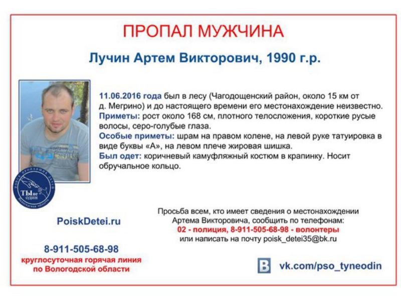 В Чагодощенском районе разыскивают пропавшего Лучина Артёма Викторовича. 11 июня он был в лесу примерно в 15 километрах от деревни Мегрино. До настоящего времени его местонахождение неизвестно, сообщает ИА «СеверИнформ» со ссылкой на ПСО «Ты не один».