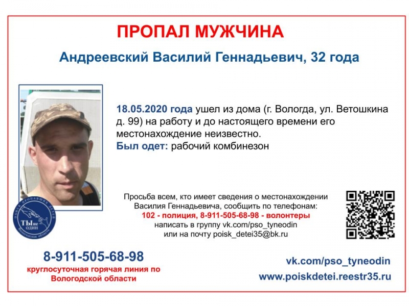 Всех, кто знает что-то о судьбе Василия Андреевского, просят обратиться в полицию или по телефону горячей линии отряда. Он указан в ориентировке, сообщает ИА "СеверИнформ".