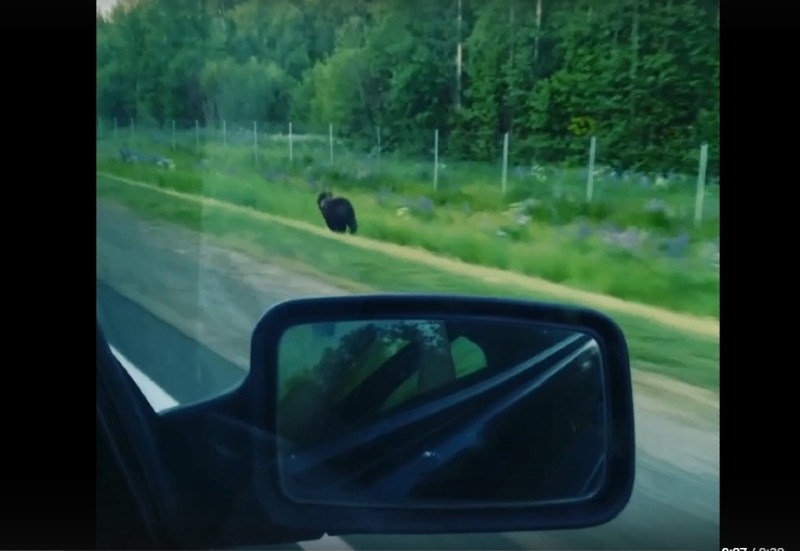 Видео с медведем, бегущим вдоль трассы, засняли проезжающие мимо.