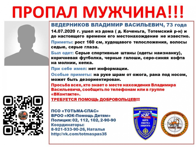 По данным ПСО "Тотьма-спас", Владимир Ведерников ростом 160 сантиметров, худощавого телосложения, с седыми волосами и серыми глазами. Был одет в серые спортивные штаны, коричневую футболку, калоши, серо-синюю кофту на молнии, кепку. Особые приметы - шрам на руке от ожога, рана под носом.