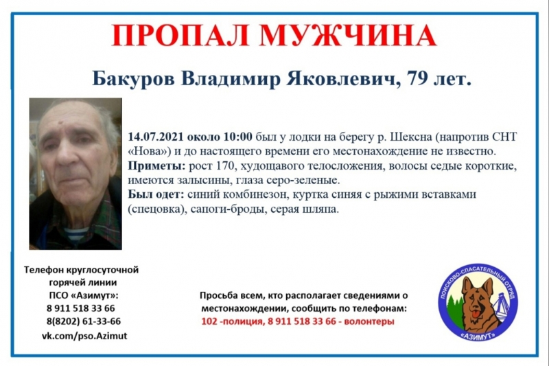 Неизвестно местонахождение 79-летнего Владимира Бакурова. В последний раз его видели около 10 утра 14 июля. Тогда пенсионер находился возле лодки на берегу реки Шексны напротив СНТ «Нова». ПСО «Азимут» распространяет информацию о поиске.