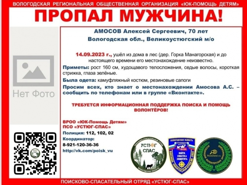 По данным ПСО «Устюг-спас», мужчина ростом 160 сантиметров, худощавого телосложения, с седыми волосами, короткой стрижкой. Был одет в камуфляжный костюм, резиновые сапоги.