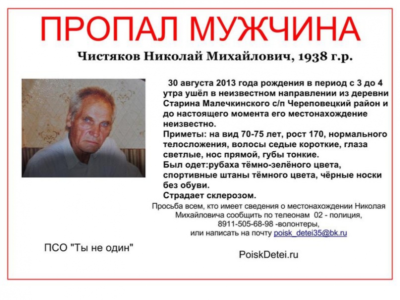 На вид мужчине 70-75 лет, он ростом 170 сантиметров. Имеет нормальное телосложение, короткие седые волосы, светлые глаза, прямой нос, тонкие губы. Был одет в темно-зеленую рубаху, темные спортивные штаны, черные носки без обуви. Пенсионер страдает склерозом, сообщает ИА «СеверИнформ» со ссылкой на группу ПСО «Ты не один».