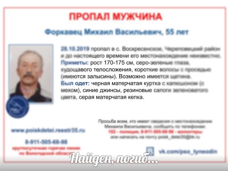 55-летний Михаил Форкавец ушел из дома в селе Воскресенское Череповецкого района еще в конце октября. Он покинул жилье в верхней одежде, но оставил телефон, документы, включенные электроприборы. По словам супруги, ее муж раньше надолго не исчезал.
