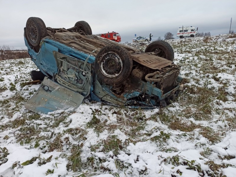 45-летний водитель Митсубиси при обгоне касательно задел Тойоту, за рулем которой находилась 35-летняя женщина. От удара обе машины закрутило на скользкой дороге, а Митсубиси выкинуло в кювет. Там иномарка встала на крышу.