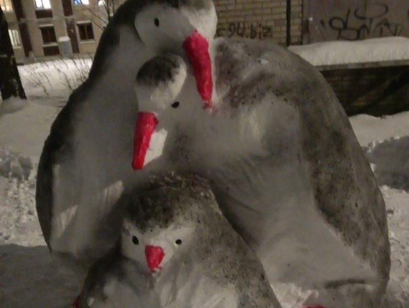 На этот раз мастер вылепил на детской площадке семью из трех пингвинов, волка, сову, а также символ будущего года - кролика.