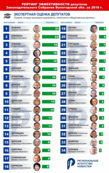 Следующий шаг - экспертная оценка. Ее высказали журналисты, политологи и общественные деятели Вологодской области. Их было восемь. Самыми эффективными они назвали депутатов: Ларису Кожевину и Андрея Луценко, Антона Холодова и Георгия Шевцова, сообщает ИА "СеверИнформ".