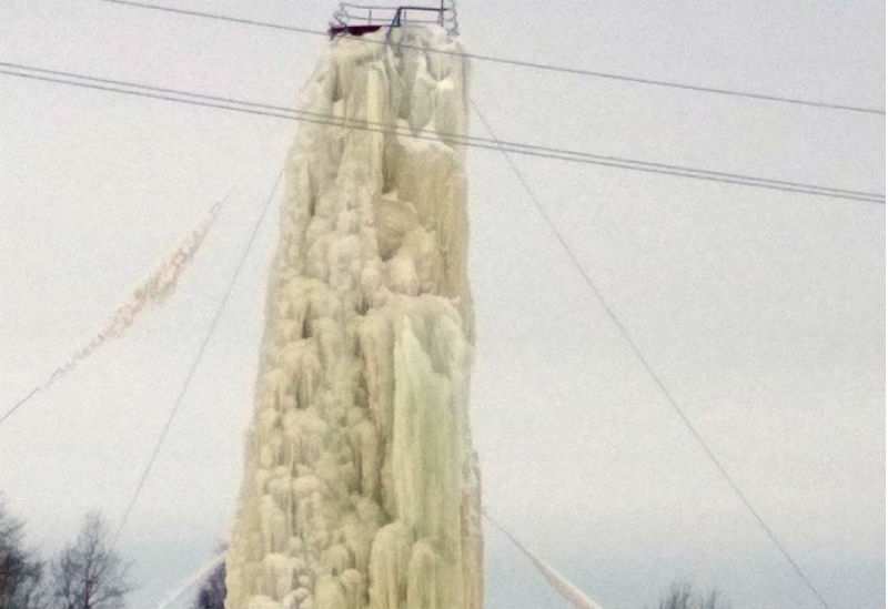 Башня превратилась в ледяную глыбу из-за того, что вода частично выливается наружу. Иначе при низких температурах она застынет внутри, что может разорвать башню, сообщает ИА «СеверИнформ».