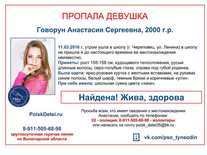 16-летнюю девушку, пропавшую в Череповце, нашли. Анастасия Говорун жива и здорова, сообщает ИА «СеверИнформ». Такая информация появилась в группе поиска «Ты не один». Где все это время находилась девушка, не сообщается.