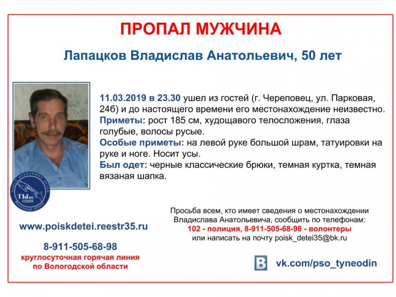 В Череповце волонтеры и полиция разыскивают пропавшего горожанина. По информации поисково-спасательного отряда «Ты не один», 50-летний Лапацков Владислав Анатольевич поздно вечером 11 марта (примерно за полчаса до полуночи) ушел из гостей на улице Парковой, 24Б и бесследно исчез. Друзья и близкие «потеряшки» также сообщают, что днем ранее мужчина отметил юбилей, а в тот вечер последним его видел сын.