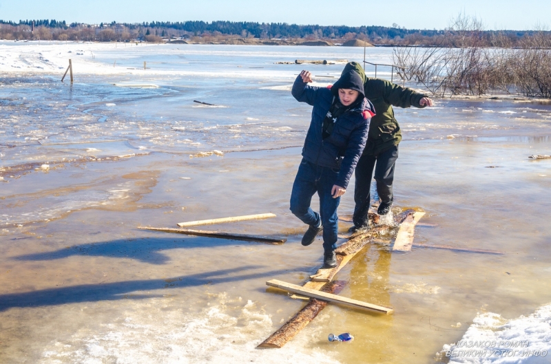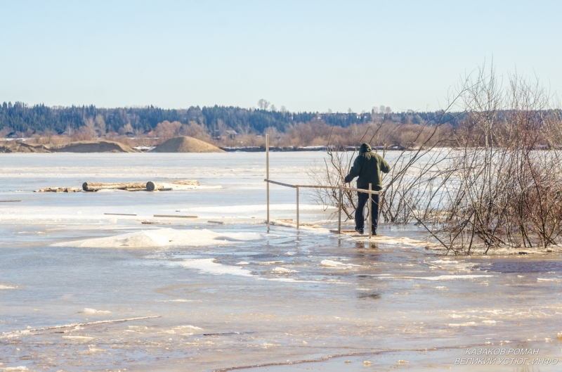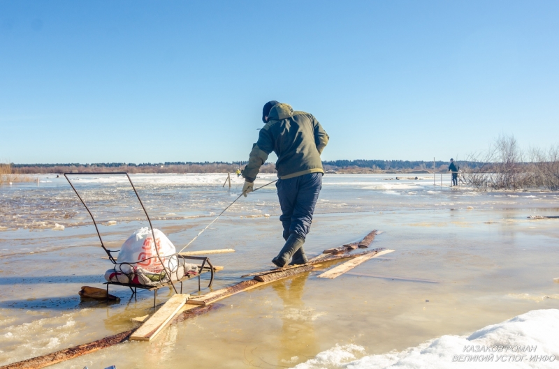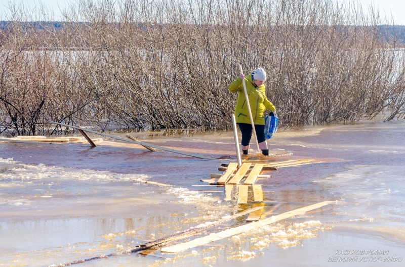 При этом необходимость для жителей попадать в Великий Устюг не отпала. Поэтому люди добираются туда по хрупкому льду, уже основательно залитому талой водой. Они обеспокоены, так как помимо физических неудобств существует реальная опасность провалиться. Среди "апостолов" есть и подростки, и пенсионеры.