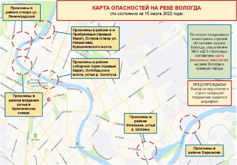 Весеннее солнце становится активнее с каждым днем. Поэтому с виду прочный лед может быть рыхлым и с промоинами. На данный момент толщина покрова на большей части водоемов составляет 28-30 см, но в наиболее опасных местах, таких как: створ улицы Ленинградской, Соборная Горка, устья рек Золотухи и Шограш, Прибрежный и Баранково лед уже стал пористым.