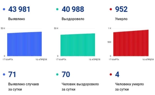 Всего с начала пандемии вирус подхватил 43981 человек, выписали с больничного 40988 пациентов. Скончались 982 больных, за минувшие сутки 4. Число жертв каждый день тоже остается практически неизменным.